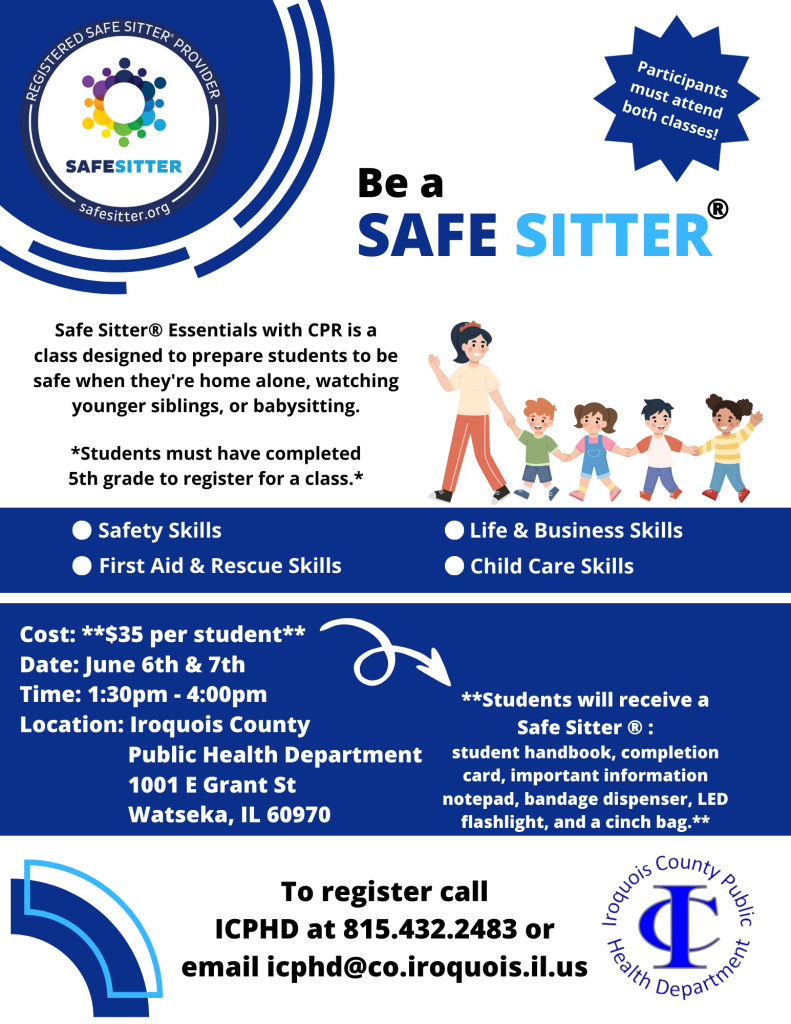 ICPHD will be hosting their second Safe Sitter® class on June 6th and 7th from 1:30pm - 4:00pm at the Iroquois County Public Health Department in Watseka, IL.